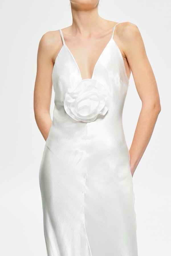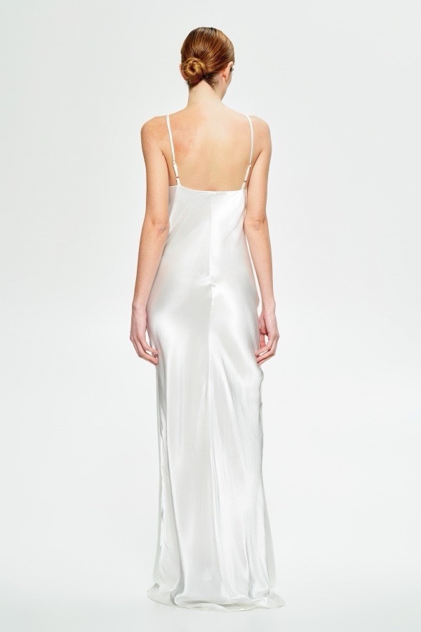 Μακρύ φόρεμα από σατέν ύφασμα, λαιμόκοψη V με λεπτές τιράντες.Λεπτομέρεια μπροστινής ραφής, φουντωτό στρίφωμα. Κανονική εφαρμογή, μέγεθος S/M, M/L.